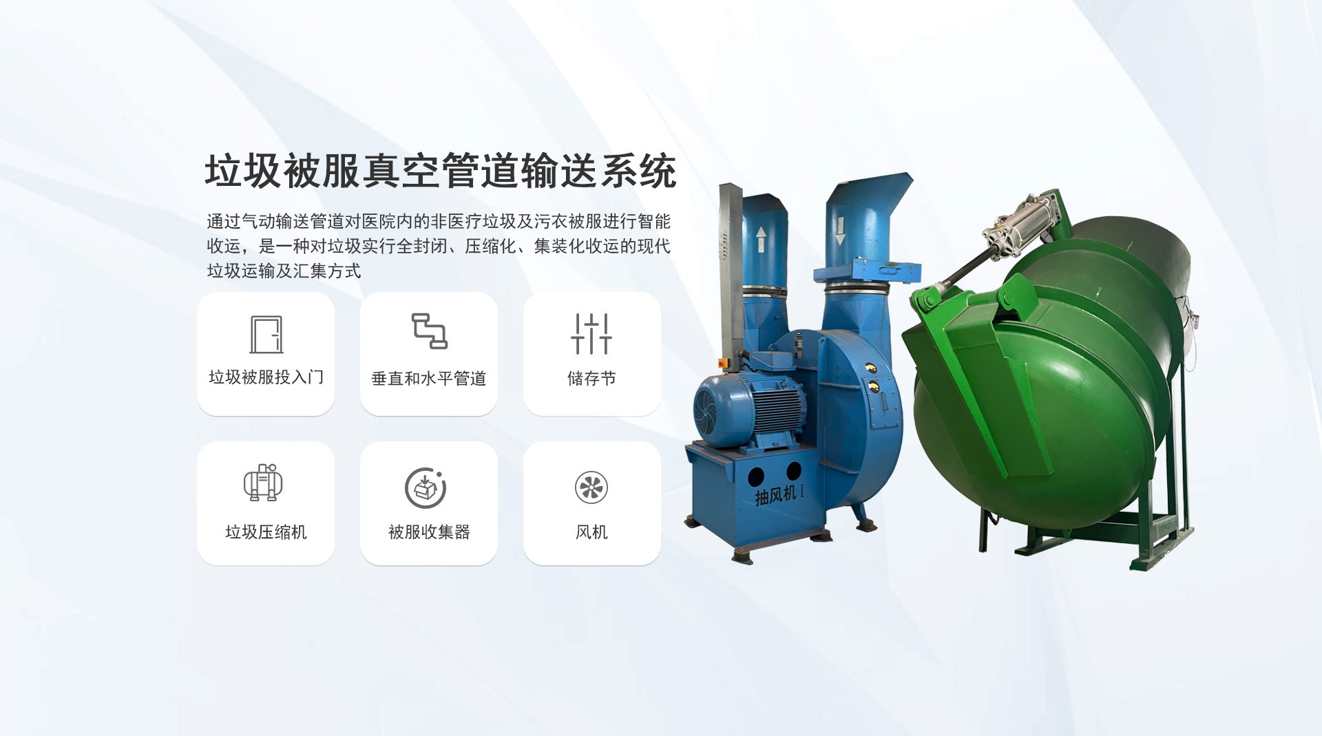 系統簡介:通過氣力式輸送管道對醫院內的垃圾和污衣被服進行收集,是一種對垃圾實行全封閉、壓縮化、集裝化收運的現代垃圾運輸及匯集方式...
